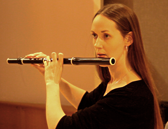 After that, Emily Bloom (below) turned up with a very old-style wooden flute and recorded some of the most haunting sounds I have ever witnessed a musician produce live. She had incredible control, innovation and empathy for the score, being asked to ad-lib sounds over some of the strings that had been recorded earlier.